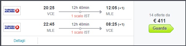 WOW, zelo ugodno v paradiž sredi Indijskega oceana! Poceni na Maldive in sicer iz Benetk že za 411 € (povratna letalska vozovnica)! Kot primer smo navedli termin od 8.6 – 16.6.2016 (7 nočitev). Skupaj z ugodnim hotelom že za 514 € na osebo v primeru, da potujeta 2 osebi. Torej za 2 osebi boste odšteli samo 1028 €! Neverjetna cena! Letalsko vozovnico rezerviraj na spletni strani www.skyscanner.it. Letalski prevoznik je Turkish Airlines.
