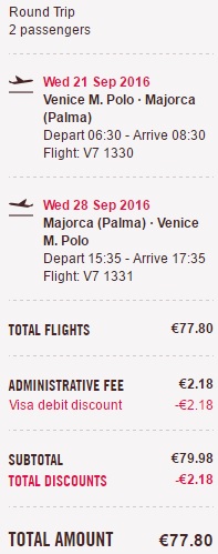 Mallorca ponuja obilico peščenih plaž, čudovito vreme in živahno nočno življenje. Nizkocenovnik Volotea te popelje iz Benetk na Mallorco že za 39 €!! v primeru, da potujeta 2 osebi (78 €). Če dodamo k tej ceni še hotel z zajtrkom (182 €) potem pridemo do cene 130 € na osebo. Kot primer smo vzeli termin 21.9 – 28.9. 2016, torej 7 nočitev.