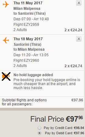 Kaj, če bi naslednje počitnice preživeli na magičnem Santoriniju? Britanski nizkocenovnik Easyjet vas popelje iz Milana na Santorini v mesecu maju 2017 že za 49 €/osebo v primeru, da potujeta 2 osebi. Če dodamo k tej ceni še hotel (7 nočitev) potem pridemo do cene 119 € na osebo v primeru, da potujeja 2 osebi. Kot primer smo vzeli termin 11.5 – 18.5. 2017. Rezervacija letalskih vozovnic www.easyjet.com.