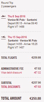 Kaj, če bi letošnje počitnice preživeli na magičnem Santoriniju? Španski nizkocenovnik Volotea te popelje iz Benetk na Santorini v mesecu septembru 2016 že za 126 €/osebo. Če dodamo k tej ceni še hotel** (7 nočitev) potem pridemo do cene 206 € na osebo v primeru, da potujeja 2 osebi. Kot primer smo vzeli termin 8.9 – 15.9. 2016. Rezervacija letalskih vozovnic www.volotea.com.