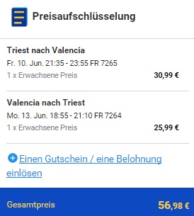 V sredini junija se ti ponuja idealna priložnost za ogled čudovitega obmorskega mesta, Valencije. To čudovito obmorsko mesto navdihuje z arhitekturo, prijetnim podnebjem in kvalitetnim nočnim življenjem. Tja se lahko iz Trsta odpravite že za 57 €! Če dodamo k temu še hotel (3 nočitve) pridemo do cene 95 €/osebo v primeru, da potujeta 2 osebi. Letalski prevoznik je irski Ryanair.. Transfer do letališča v Trstu lahko narediš z Gooptijem. Kot namig vam mogoče priporočamo ogled nogometne, košarkaške ali rokometne tekme.