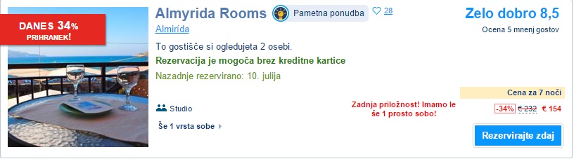 Ponuja se ti priložnost čudovitega dopusta na največjem grškem otoku, Kreti. Glavno mesto je Heraklion, priporočamo pa ti zahodni del otoka, ki je čudovit. Povratne letalske vozovnice so v mesecu septembru na voljo že od 63 € naprej. Če temu dodamo 7x nočitev, te bodo 8 dnevne počitnice prišle zgolj 140 €/osebo, če potujeta 2 osebi. Na voljo je več terminov, za tebe pa smo izbrali termin od 17. – 24. september. Prihod in odhod je iz Trevisa.