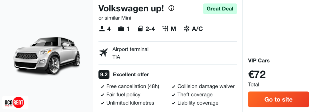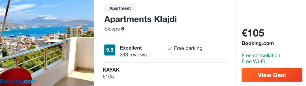 Kot primer smo navedli dopust z letalom. Za 7 nocitev v zelo dobro ocenjenem apartmaju Klajdi Apartments v obmorskem meaty Saranda, povratno letalsko karto in najem avtomobila za vse dni. V terminu od 23.10 – 30.10. 2021 boste za vse skupaj odsteli samo 145 €, v primeru, da se na dopust odpravita 2 osebi. Anyone?