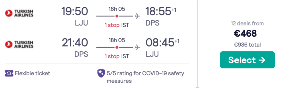 Kdo si želi naslednjo zimo preživeti na rajskem Baliju? Trenutno lahko kupite povratno letalsko vozovnico iz naše Ljubljane v Denpasar za samo 468 €! Na voljo je veliko terminov skozi vse leto. V upanju, da se situacija s pandemijo umiri smo dali kot primer v mesecu novembru. Če dodate k temu še 9 nočitev v hotelu**** boste odšteli samo 537 €! Kot primer smo vzeli termin od 05.11 – 15.11. 2021. Letalski prevoznik je vec kot odlicni Turkish Airlines. Tako letalske karte kot hoteli so fleksibilne narave in ni skrbi, da bi v primeru ne potovanja bili ob vplacan znesek. Gremo?