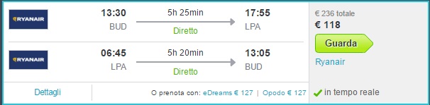 Kanarski otoki so zopet na voljo po zelo ugodni ceni. Privoščite si počitnice na Gran Canariji, ki je priljubljena počitniška destinacija z razvitimi počitniškimi naselji na jugu ter živahnim in modernim Las Palmasom na severu. Počitnice na tem otoku obljubljajo celoletno toplo in suho vreme ter veliko osupljivih plaž vse okoli otoka. Tja lahko v maju iz Budimpešte letite za 118€ (povratna letalska vozovnica), če pa temu prištejemo še 7x nočitev, potem te bodo počitnice prišle samo 192 €/osebo, če potujeta 2 osebi. Letalski prevoznik je Ryanair.