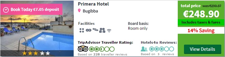 Ponuja se odlična priložnost za dopustovanje na sončni Malti in to v top sezoni. Povratne letalske vozovnice se v septembru začnejo že od 51 € dalje. Če temu prištejemo še 7 nočitev v hotelu*** pridemo do super cene 175 €/osebo, če potujeta 2 osebi. Za polpenzion boš odštel/a 243 €! Tako so počitnice na Malti v poletnih počitnicah resnično dosegljive za vsakogar. Na voljo je nekaj terminov v septembru, za vas pa smo kot primer vzeli termin med 18. – 25. septembrom. Za transfer do letališča preveri www.goopti.com. Odhod je iz Trevisa!