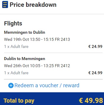 MEMMINGEN – DUBLIN – MEMMINGEN (www.ryanair.com) – ročna prtljaga