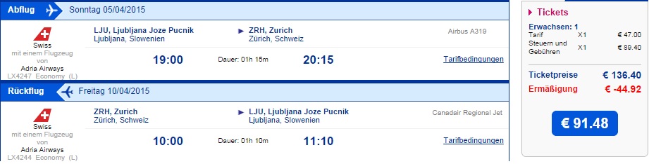 Super ugodna ponudba letov v švicarsko mesto Zurich iz ljubljanskega letališča. Letalski prevoznik je naša nacionalka Adria Airways. Vozovnico lahko kupite na spletni strani www.airtickets.de za 91 € in ne na spletni strani prevoznika. Edini pogoj za nakup vozovnice je plačilo z Diners kartico! Po takšni ceni lahko potujete od marca pa vse do oktobra, torej tudi čez poletje!
