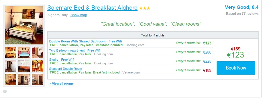 Ponujamo vam odlično priložnost za pobeg na sončno Sardinijo. Na voljo je nekaj terminov v mesecu aprilu. Cene povratnih letalskih vozovnic pa se začnejo že pri 35 €. Za vas smo kot primer vzeli termin od 13. – 17. aprila. Tako boste za 4 nočitve z zajtrkom in povratno letalsko vozovnico odšteli samo 97 €/osebo, če potujeta 2 osebi. Odhod in prihod pa je iz Trsta.