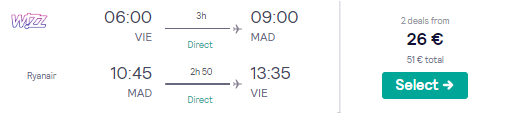 Je Madrid na listi vaših želja? Sedaj se vam ponuja city break v glavnem mestu Španije zelo ugodno. Povratne letalske vozovnice se v mesecu marcu in aprilu začnejo že pri 26 €. Tako boste za letalsko vozovnico in 3 nočitve v dvoposteljni sobi odšteli zgolj 80 €, če potujeta 2 osebi. Na voljo je več terminov, kot primer pa smo zapisali datum od 17. – 20. april 2020. Odhod in prihod je z Dunaja.