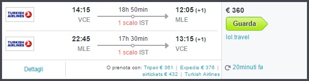 WOW! Poceni na Maldive in sicer iz Benetk že za 360 € (povratna letalska vozovnica)! Kot primer smo navedli termin od 8.6 – 16.6.2016 (7 nočitev). Skupaj s ugodnim hotelom že za 463 € na osebo v primeru, da potujeta 2 osebi. Torej za 2 osebi boste odšteli samo 926 €! Neverjetna cena! Letalsko vozovnico rezerviraj na spletni strani www.skyscanner.it. Letalski prevoznik je Turkish Airlines.