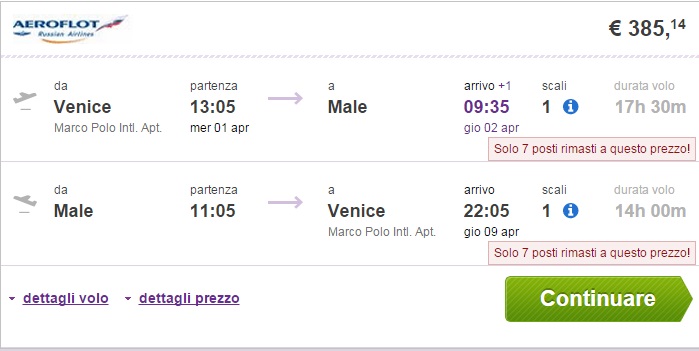Izredno poceni na Maldive in sicer iz Benetk že za 385 € (povratna letalska vozovnica). Skupaj z poceni hotelom + zajtrkom + WI-FI že za 507 € na osebo v primeru, da potujeta 2 osebi (7 nočitev – 1.4-9.4. 2015). Vrhunska cena! Letalski prevoznik je Aeroflot. Rezervacijo vozovnice naredi na spletni strani www.budgetair.it.