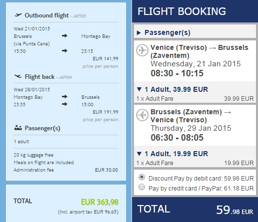 Kako se slišijo počitnice na karibski Jamajki? Predvsem sončno in toplo. Kombiniran let iz Trevisa preko Bruslja (kjer lahko spijete tudi kavico) v Montego Bay in nazaj že za 424 €. Rezervacijo naredi na spletnih straneh www.jetairfly.com in www.ryanair.com. Skupaj s poceni prenočiščem (od 224 € naprej za 7 nočitev/2 osebi) že za 536 €. Termin potovanja je od 21.1 – 28.1. 2015.