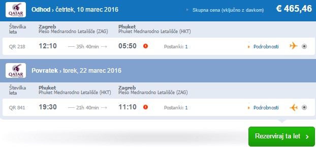 Na rajsko in nikoli nenaveličano Tajsko greš lahko zelo poceni. Za povratno letalsko vozovnico do Phuketa, kjer lahko uživate v turkiznem morju, belemu pesku in soncu boste odšteli samo 465 € in to z eno izmed najboljših letalskih družb na svetu Qatar Airways. Let je iz Zagreba. Rezervacijo lahko narediš na spletni strani www.tripsta.si. Za hotel**** in vozovnico (10.3 – 22.3. 2016) boš odštel/a samo 613 €. Gremooooooo!