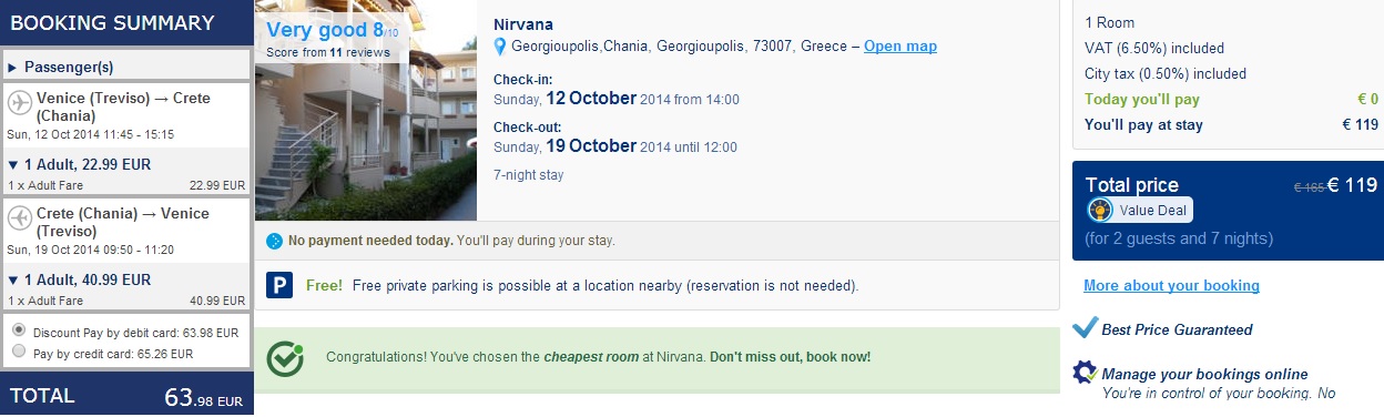 Kreta je razgiban otok zabave in rajskih peščenih plaž. Velika je skoraj kot polovica Slovenije in na njej živi več kot 600.000 prebivalcev. Je največji grški otok in peti največji otok v Mediteranu. Glavno mesto je Heraklion, priporočamo pa vam zahodni del otoka, ki je čudovit. Današnja ponudba vključuje (12 – 19. oktober) letalski prevoz iz Trevisa, hotel apartma in transfer z Gooptijem do letališča in nazaj iz Ljubljane. Izračun je narejen, če potujejo 2 osebi.