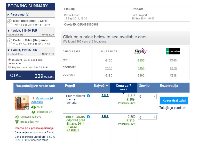 V kategoriji “Počitnice za 4” bomo vedno objavili kakšno super ugodno kombinacijo počitnic ali dopusta v katero je vključen povratni letalski prevoz, hotel ali apartma in rent a car za vse dni. Edino kar morate narediti je to, da se na letališče odpravite v lastni režiji (beri spodaj). Tokrat smo izbrskali poceni 7-dnevni oddih na otoku Krf v Grčiji. Najcenejši termin je od 18 – 25 septembra. Zanj boste po naših izračunih odšteli cca 745 € ali 186 € na osebo!