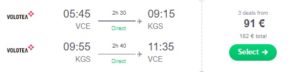 Otok Kos velja za enega najbolj sončnih otokov v Egejskem morju. Na tem otoku se je rodil Hipokrat, oče moderne medicine. Tam vas španski nizkocenovnik Volotea popelje iz Benetk v mesecu juniju oz juliju že za 91 €. Če dodamo k tej ceni še 7x nočitev v hotelu potem pridemo do cene 196 €/osebo, v primeru, da potujeta 2 osebi. Kot primer smo vzeli termin 27.6 – 4.7. 2019.