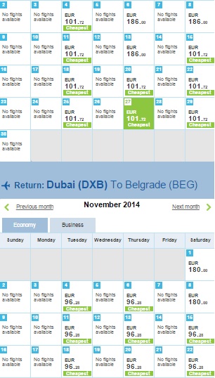 Želite zelo poceni v mesto prestiža, dobrih avtomobilov in neverjetne infrastrukture? Imamo super ponudbo za vas. Čas potovanja je od novembra do decembra, povratno letalsko vozovnico pa lahko kupite za super ugodnih 198 €. Let je iz Beograda z letalsko družbo Flydubai. Ne oklevajte in rezervirajte, akcija se konča 24. oktobra.
