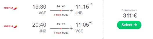 V Južno Afriko se lahko odpravite zelo poceni. Iz Benetk vas španska letalska družba Iberia odpelje v Johannesburg že za 312 €! Karte so na voljo v mesecu januarju, februarju, marcu in aprilu. Na voljo je veliko terminov. Ste za safari?