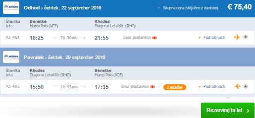 Rodos je četrti največji grški otok in leži v vzhodnem delu Egejskega morja. Otok se nahaja malo manj kot 20 km od Turčije kar lahko izkoristite tudi za dnevni izlet. Pohvali se lahko z več kot 300 sončnimi dnevi na leto, kar mu zagotavlja sezono od maja do oktobra. Na otoku živi približno 115.000 ljudi. Kot primer smo vzeli termin med 22 – 29 septembrom v katerega je vključen povratni letalski prevoz in hotel apartma z zajtrkom. Cena 118 €/osebo.
