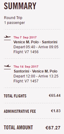 Kaj, če bi naslednje poletne počitnice preživeli na magičnem Santoriniju? Španski nizkocenovnik Volotea vas popelje iz Benetk na Santorini v mesecu septembru 2017 že za 67 €/osebo. Če dodamo k tej ceni še hotel (7 nočitev) potem pridemo do cene 155 € na osebo v primeru, da potujeja 2 osebi. Kot primer smo vzeli termin 7.9 – 14.9. 2017. Rezervacija letalskih vozovnic www.volotea.com.