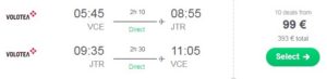 Kaj, če bi letošnje počitnice preživeli na magičnem Santoriniju? Španski nizkocenovnik Volotea vas popelje iz Benetk na Santorini v mesecu septembru 2018 že za 99 €/osebo. Če dodamo k tej ceni še hotel (7 nočitev) potem pridemo do cene 178 € na osebo v primeru, da potujejo 4 osebe. Kot primer smo vzeli termin 19.9 – 26.9. 2018. Rezervacija letalskih vozovnic www.volotea.com.