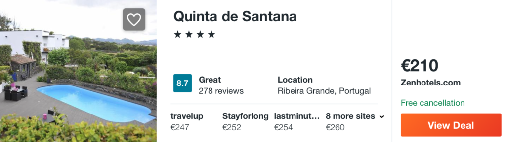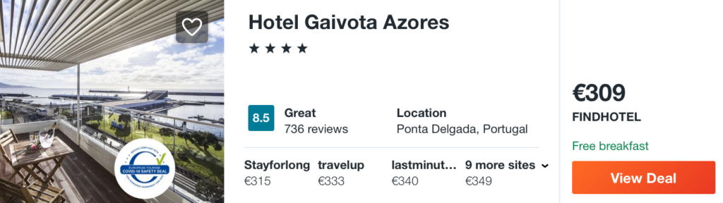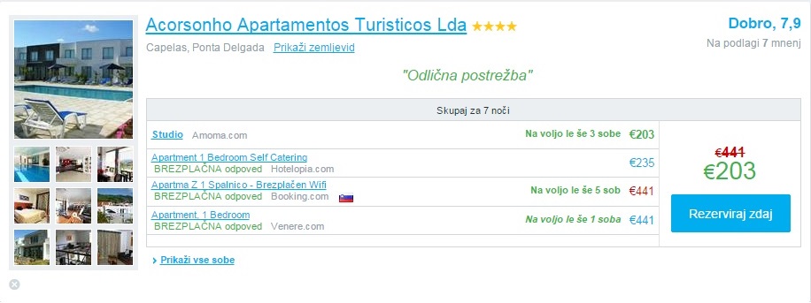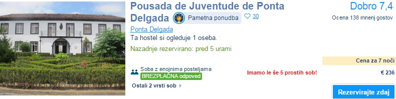 Kot drugo opcijo smo zapisali 7 nocitev v glavnemu mestu Ponta Delgadi v hotelu **** z zajtrkom in povratno letalsko karto boste odsteli 192 €! Gre za odlicen hotel.