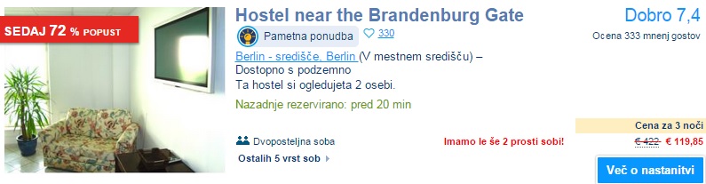 Izkoristite odlično priložnost in si privoščite ogled, raziskovanje ali pa city break v prečudoviti in z zgodovino prepleteni nemški prestolnici. Berlin, glavno mesto Nemčije s 3,5 milijona prebivalcev je največje mesto v državi. Sedaj pa so vam v mesecu novembru na voljo povratne letalske vozovnice že od 52 € dalje. Če temu dodamo 3 nočitve, vas bo city break v Berlinu prišel samo 116 €/osebo, če potujeta 2 osebi. Na voljo je kar nekaj terminov čez cel mesec. Prihod in odhod je iz Trevisa.