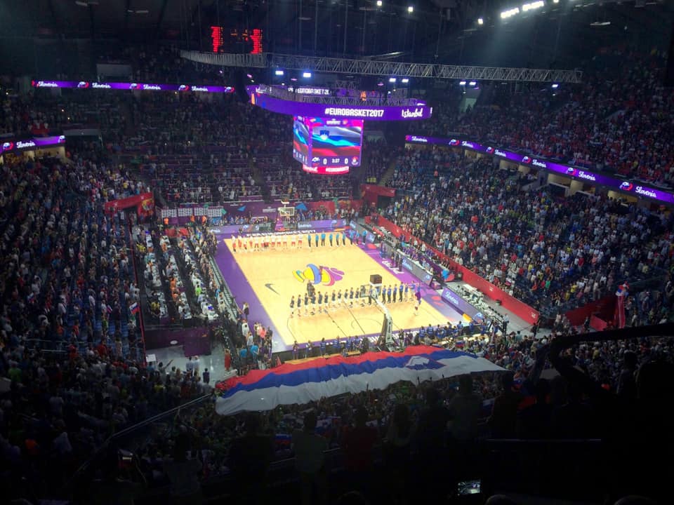 👟 Nastanili smo se v hotelu. Po osvežitvi smo nekateri odhiteli do mesta, se sprehodili od Taksima do Galate Towerja, naredili nekaj fotk s srbskimi prijatelji in se odpravili do slovenske ulice. Začela se je navijaška mrzlica. Dve uri do tekme pridemo v dvorano Sinan Erdem. Dvorana ni bila polna, saj si je tekmo ogledalo nekaj več kot 12 tisoč gledalcev, dvorana sprejme nekaj več kot 16 tisoč. Mirno lahko rečem, da nas je bilo cca 7 tisoč. Vzdušje je bilo noro!