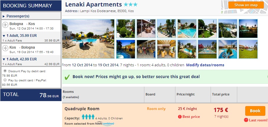 Otok Kos velja za enega najbolj sončnih otokov v Egejskem morju. Na tem otoku se je rodil Hipokrat, oče moderne medicine. Otoke se nahaja v bližini Turčije, zato je idealno izhodišče za izlet tam. Kot primer smo vzeli termin 12.10 – 19.10. Za povratno letalsko vozovnico boste odšteli 79 €, rent a car 140 €, za Hotel boste odšteli 175 € (7 nočitev), za transfer do letališča pa boste odšteli 160 €. Če vse skupaj seštejemo pride 198 € po osebi, če se vas na pot odpravi 4 in imate lastno sredstvo za transfer do letališča.