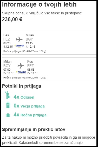 Prenočišča – cca 110 €, (povprečno boste za nočitev z zajtrkom porabili 12 € na osebo) – lahko vas bo prišlo tudi več ali celo manj. Priporočamo vam, da jih ne rezervirate preko spleta, ampak to naredite v samem kraju. Dobro je predhodno vsaj malo naštudirati kje približno boste naredili nočitev, kajti v medinah je mogoče malo težje najti izbrani hotel ali Riad. Preverite na (www.booking.com). Hostli v Marrakeshu in Fezu so dosegljivi že za 5 €/noč.
