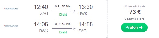 Na otok Brač z letalom. Povratne letalske vozovnice iz Zagreba na Bol na Braču so v mesecu juliju na voljo za super ugodnih 77 €. Letalski prevoznik je Croatia Airlines. Rezervacijo naredite na spletni strani www.skyscanner.ie. S seboj imate lahko tudi oddano prtljago. Če k temu dodamo še 7 nočitev v studiju za 2 osebi boste odšteli samo 179 €.
