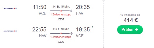 Kuba, rajska destinacija za vsakega avanturista. Tokrat lahko uresničite svoje sanje, saj se lahko iz Benetk z Air France z indirektnim letom zelo ugodno odpravite na ta čudovit karibski otok. Povratna letalska vozovnica trenutno stane samo 409 €! Preprosto odlična cena! Na voljo je vec terminov v mesecu juniju.