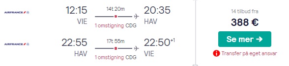 Že od malih nog vsak od nas sanja, da bi šel na Kubo. Tokrat lahko uresničite svoje sanje, saj se lahko z Dunaja z letalsko družbo Air France zelo ugodno odpravite na ta čudovit karibski otok. Povratna letalska vozovnica trenutno stane samo 388 €! Preprosto odlična cena! V ceno je všteta ročna prtljaga.