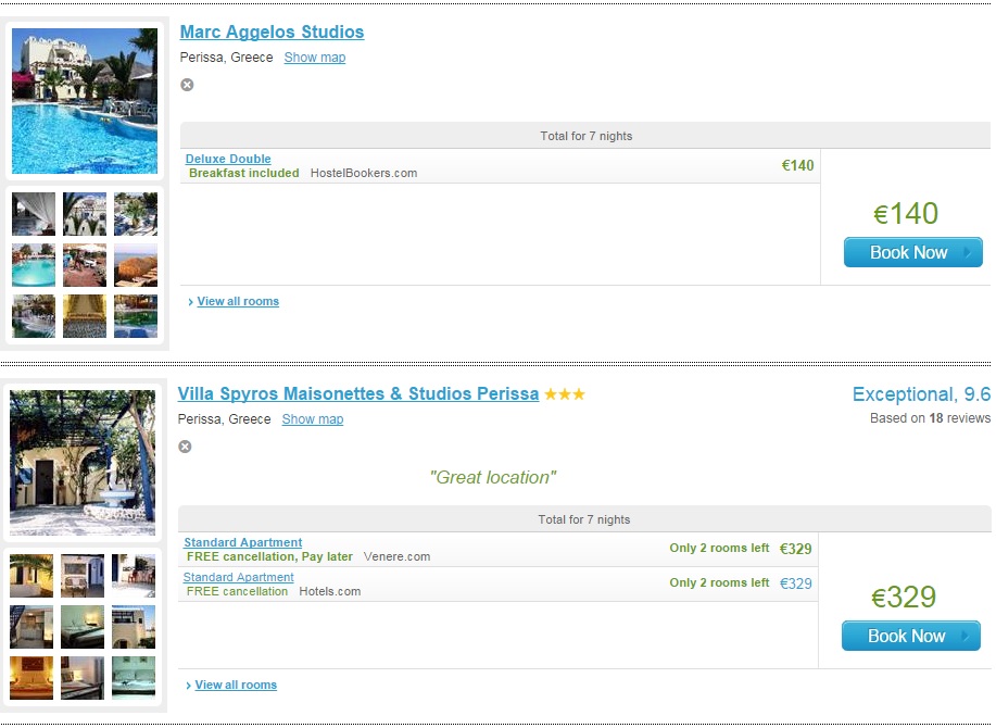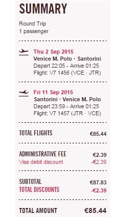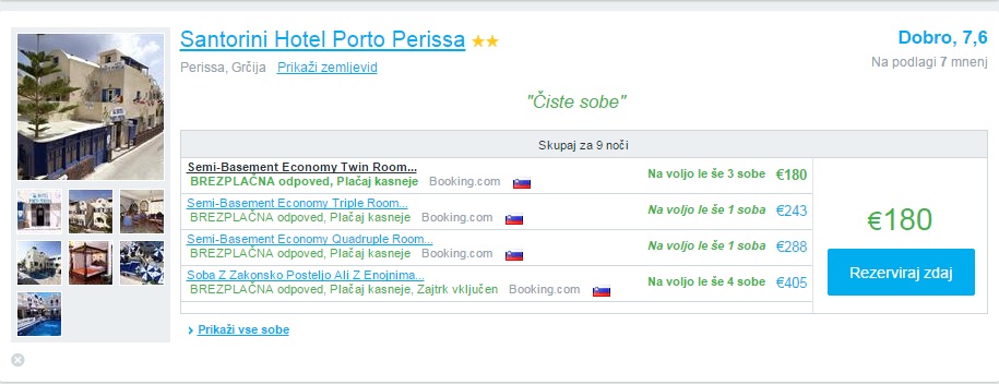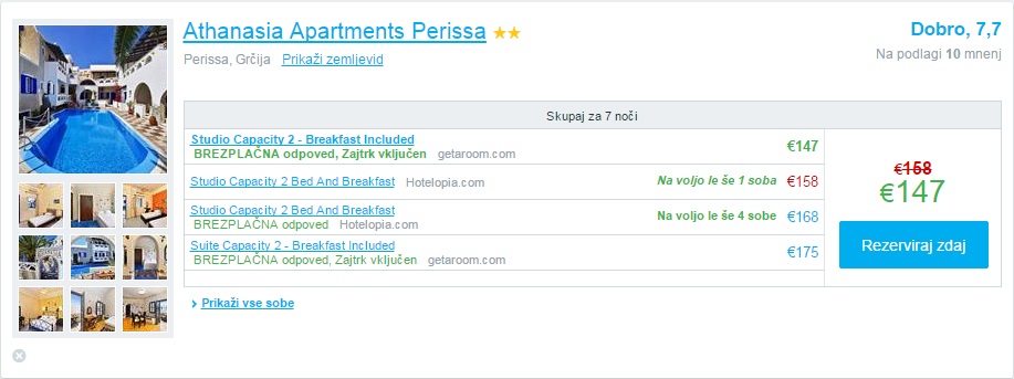 Poceni počitnice na Santoriniju. Grška nacionalka Aegean vas popelje iz Beograda na Santorini (via Atene – možen ogled in kavica) v mesecu maju 2015 že za 115 €. Če dodamo k tej ceni še hotel*** z zajtrkom za 7 nočitev potem pridemo do cene 189 € na osebo v primeru, da potujeta dve osebi. Kot primer smo vzeli termin 23.5 – 30.5. 2015.