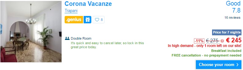 Dvoposteljna soba z zajtrkom, 7x nočitev (10.-17.maj), 224 € www.venere.com