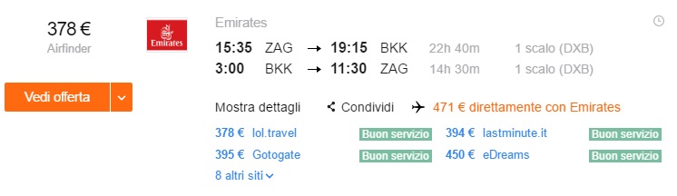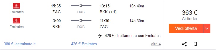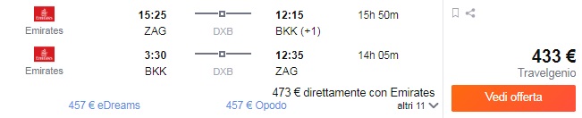 Trenutno ena izmed najboljših letalskih družb na svetu Emirates (5 star world airline) ponuja ugodne povratne lete iz Zagreba v oddaljeno prestolnico Tajske, Bangkok že za 433 €. Odlična cena! Na voljo je veliko terminov v spomladanskem času. Rezervacijo naredite na spletni strani www.kayak.it.