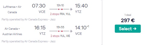 Toronto ima 2.482.000 prebivalcev in je glavno mesto province Ontario ter hkrati največje mesto v Kanadi. Ta primat je v 70. letih 20. stoletja prevzelo od Montréala. Indirektni leti letalskih družb Luftahansa, Austria Airlines, Air France in Air Canada so iz Benetk v mesecu marcu in aprilu na voljo za odličnih 297 €. Za nekaj evrov več tudi v toplejših terminih. Na voljo je več terminov. V ceno je vključena ročna prtljaga.