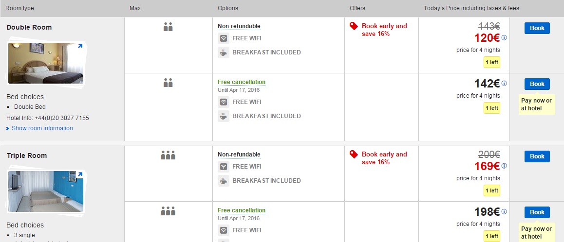 Hotel: dvoposteljna soba, 4x nočitev z zajtrkom, (18.-22. april) 120€  rezerviraj:  www.venere.com
