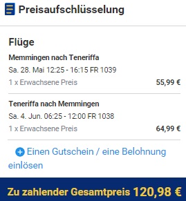 MEMMINGEN – TENERIFE – MEMMINGEN (www.ryanair.com) – ročna prtljaga