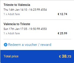 V začetku januarja se ti ponuja idealna priložnost za ogled čudovitega obmorskega mesta, Valencije. To čudovito obmorsko mesto navdihuje z arhitekturo, prijetnim podnebjem in kvalitetnim nočnim življenjem. Zelo ugodne ponudbe se ti ponujajo v mesecu januarju prihodnje leto. Tja se lahko iz Trsta odpravite že za 39 €!. Če dodamo k temu še hotel (4 nočitve) pridemo do cene 91 €/osebo v primeru, da potujeta 2 osebi. Letalski prevoznik je irski Ryanair.. Transfer do letališča v Trstu lahko narediš z Gooptijem. Kot namig vam mogoče priporočamo ogled nogometne, košarkaške ali rokometne tekme.