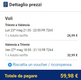 V mesecu maju se vam ponuja idealna priložnost za ogled čudovitega obmorskega mesta, Valencije. To čudovito obmorsko mesto navdihuje z arhitekturo, prijetnim podnebjem in kvalitetnim nočnim življenjem. Tja se lahko iz Trsta odpravite že za 60 €!. Če dodamo k temu še hotel (4 nočitve) pridemo do cene 112 €/osebo v primeru, da potujeta 2 osebi. Letalski prevoznik je irski Ryanair.. Transfer do letališča v Trstu lahko naredite z Gooptijem. Kot namig vam mogoče priporočamo ogled nogometne, košarkaške ali rokometne tekme.
