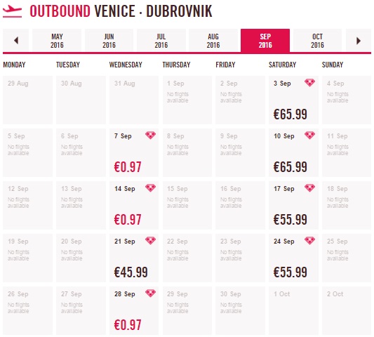 Za Dubrovnik velja za enosmerne lete iz Benetk skoraj ves mesec september 2016! WOW.