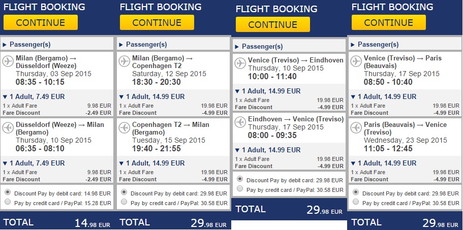 Super akcija irskega letalskega prevoznika Ryanair za številne destinacije po Evropi iz bližnjih letališč. Tako lahko kupiš enosmerno vozovnico že za 7,5 €, povratno pa že za pičlih 15 €! V ceno je vključena ročna prtljaga. Torej kako se sliši, da greš iz bližnjih v Belgijo, Francijo, Nemčijo, Irsko, Španijo, Anglijo, Nizozemsko, Litvo, Romunijo, Poljsko, Dansko, Italijo (Sardinija, Sicilija) že za 7,5 €? Nekaj zanimivih smo izbrskali in si jih lahko pogledaš spodaj. Poskušaj organizirati, da se na pot odpravite 4, kajti prišparali boste kar nekaj € za transfer do letališča, če greste v lastni režiji. Vse letalske vozovnice rezerviraj na spletni strani www.ryanair.com. Let’s travel people.