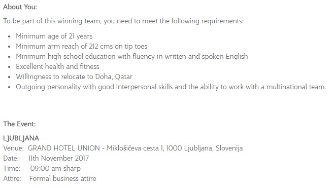 Želiš videti svet poprek in počez? Želiš biti stevardesa? Sanjska služba čaka nate. Ena izmed najboljših družb na svetu Qatar Airways išče nove moči znova v Sloveniji. 11 novembra 2017 ob 9.00 lahko pridete na avdicijo v Ljubljano, GRAND HOTEL UNION – Miklošiceva cesta 1, 1000 Ljubljana, Slovenia. Več informacij dobite na www.qatarairways.com.