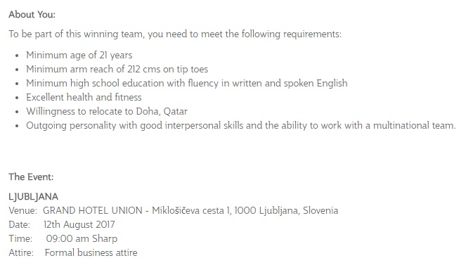Želiš videti svet poprek in počez? Želiš biti stevardesa? Sanjska služba čaka nate. Ena izmed najboljših družb na svetu Qatar Airways išče nove moči znova v Sloveniji. 12 avgusta 2017 ob 9.00 lahko pridete na avdicijo v Ljubljano, GRAND HOTEL UNION – Miklošičeva cesta 1, 1000 Ljubljana, Slovenija. Več informacij dobite na www.qatarairways.com.