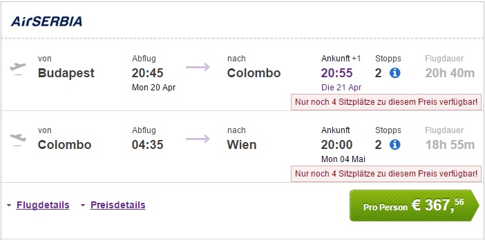Zamenjajte okolje in doživite nekaj novega in divjega. Našli smo super poceni opcijo škarjastega leta (open jaw) leta na Šrilanko in sicer s štartom iz Budimpešte ter povratkom na Dunaj. Cena povratne letalske vozovnice je 367 €. Na voljo je več terminov. Rezervacijo naredi na spletni strani www.flugladen.at. Letalski družbi sta Air Serbia in Etihad. Čas potovanja je med aprilom in junijem.